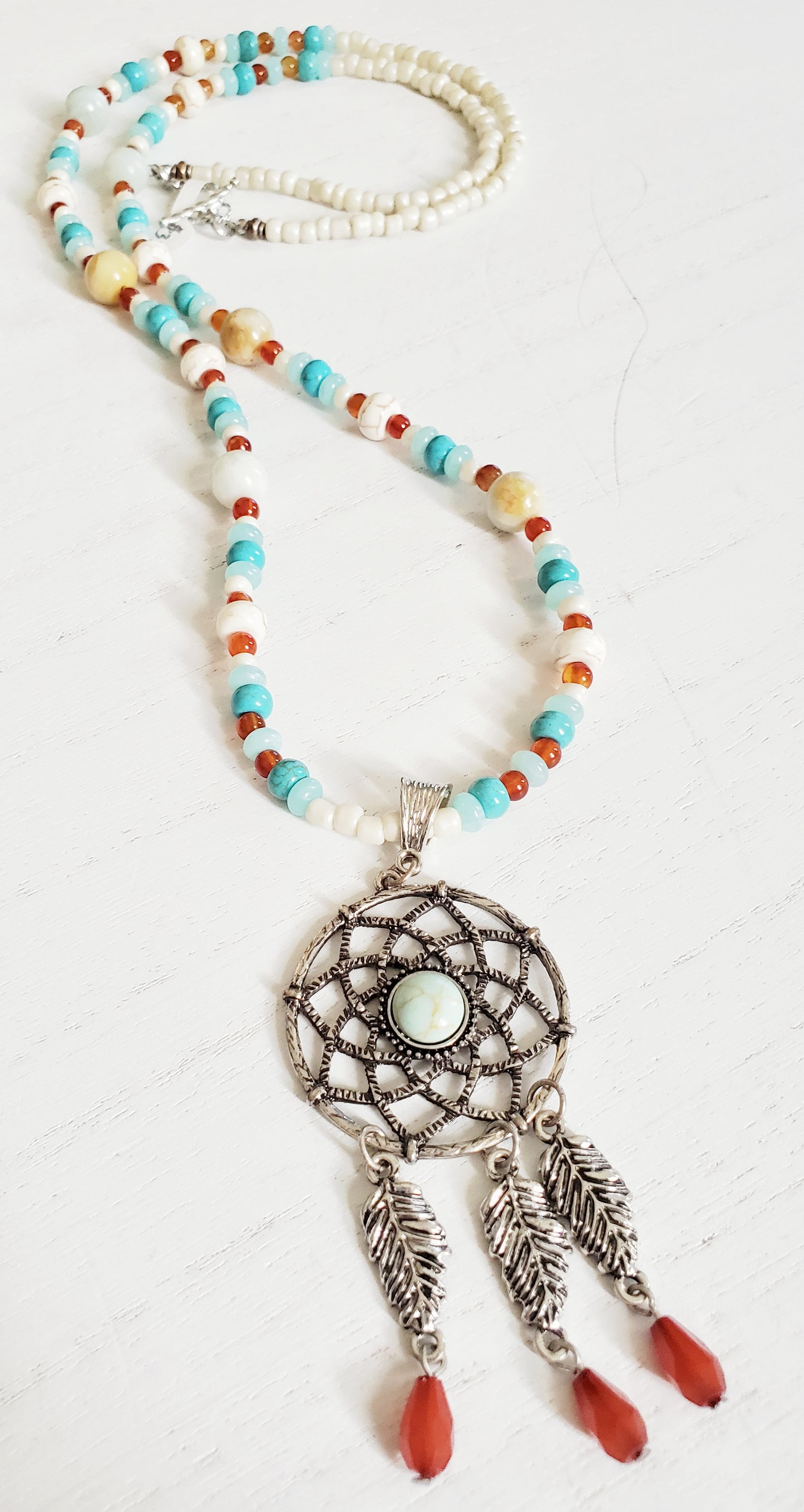 - Made with a silver metal, glass bead and Howlite Dream catcher pendant