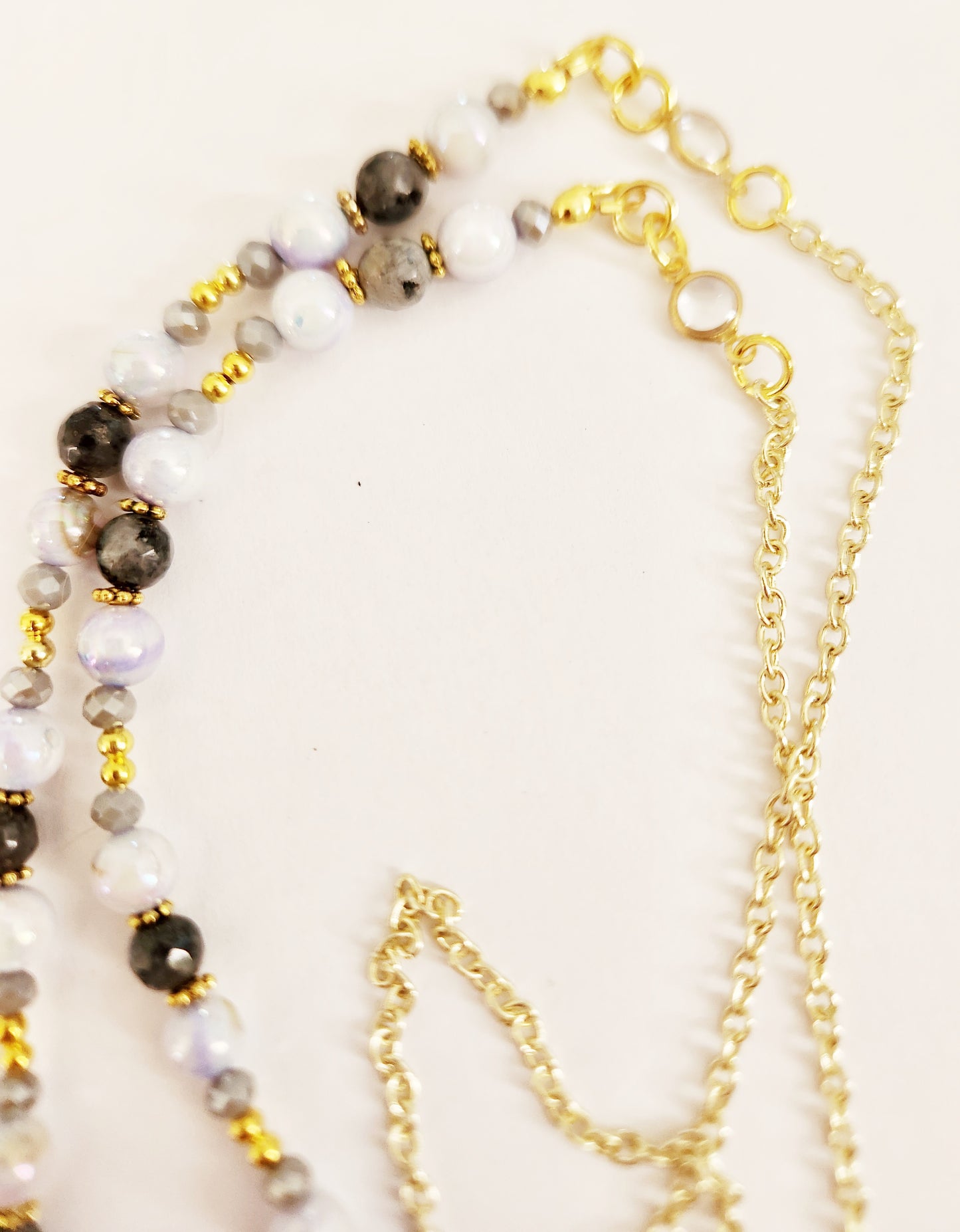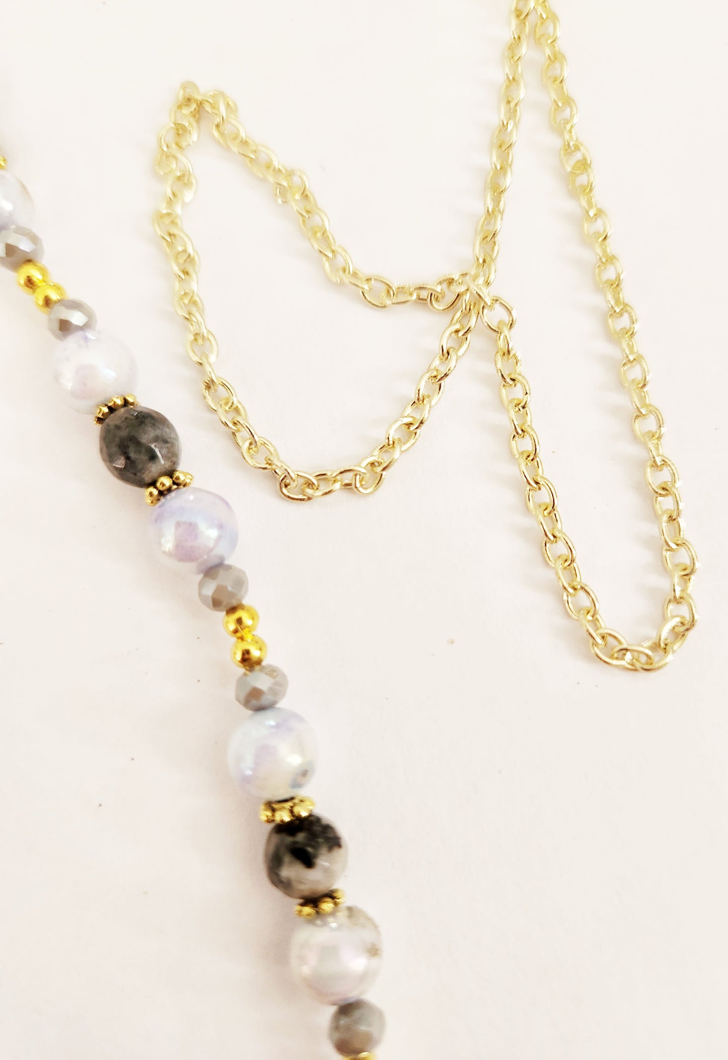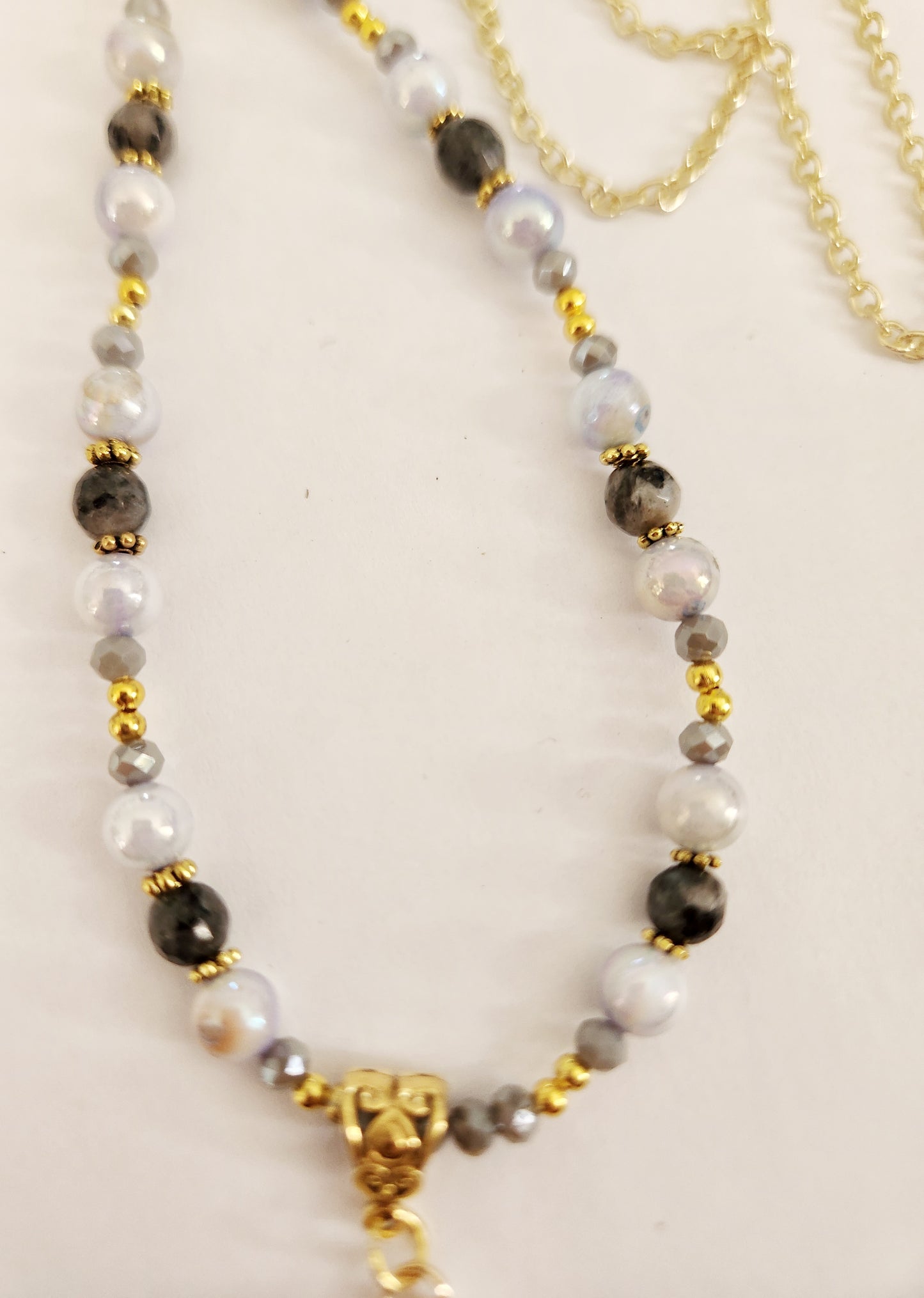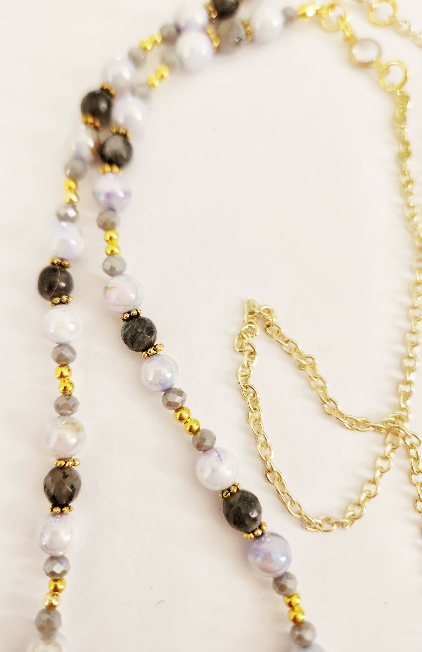 - Accented with blue Mother of Pearl and Larkavite gemstone beads and grey glass beads