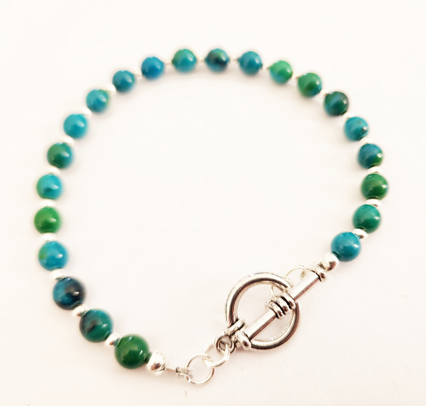 Chrysocolla gemstone beaded bracelet, silver toggle clasp
