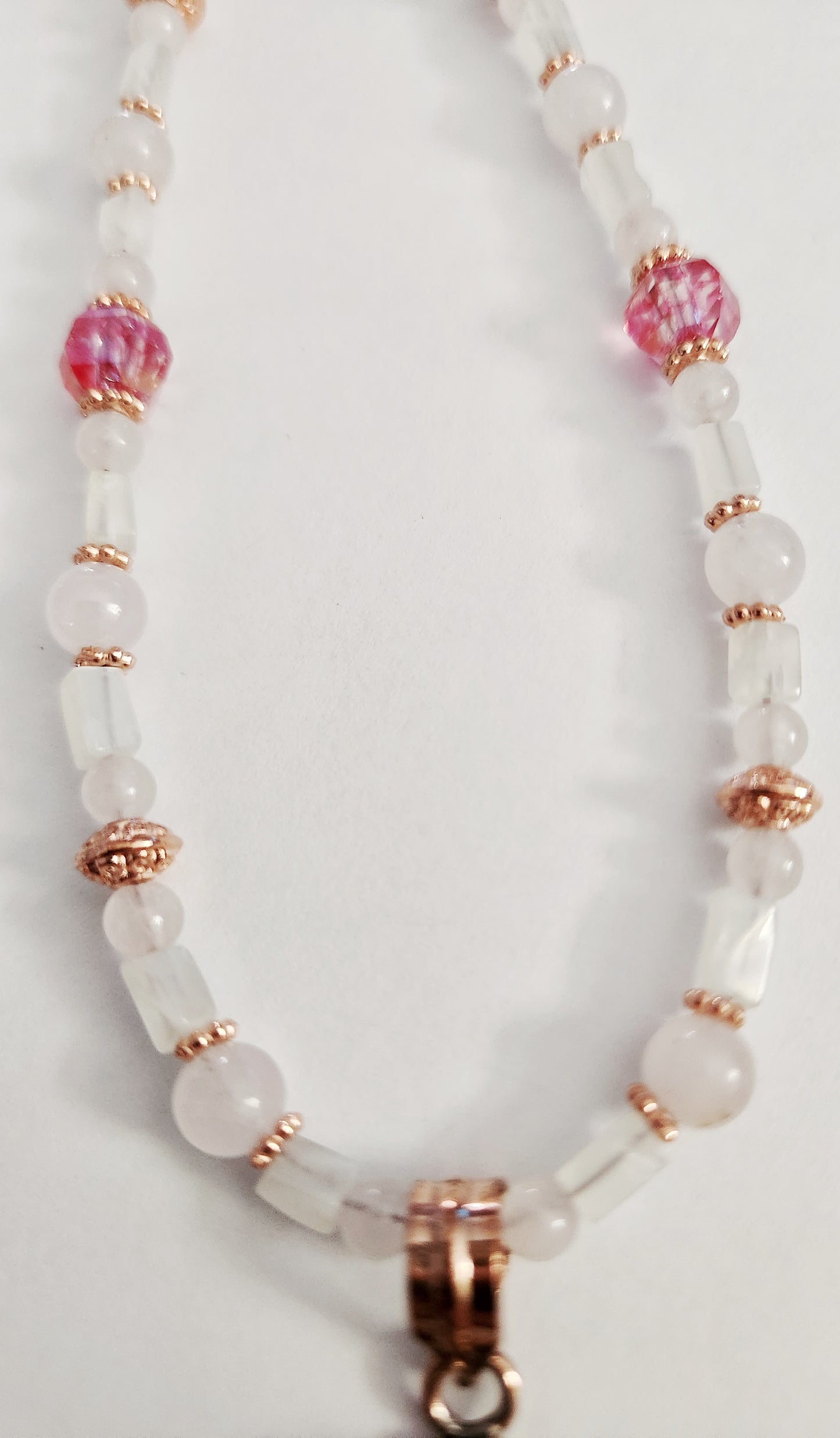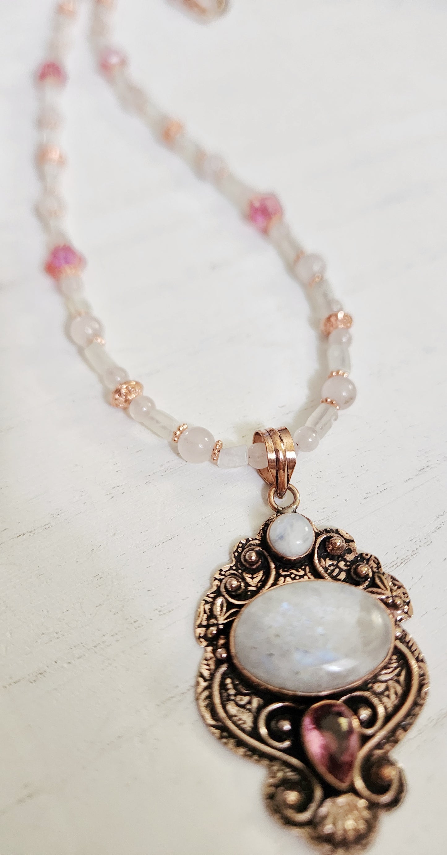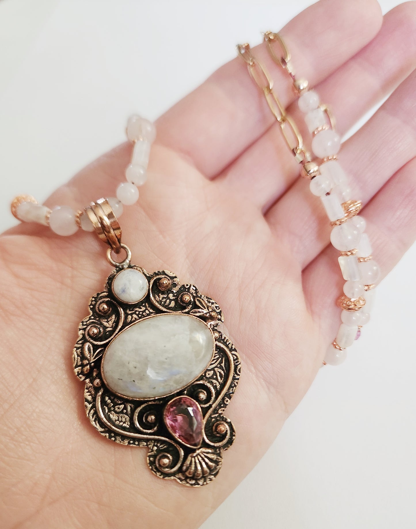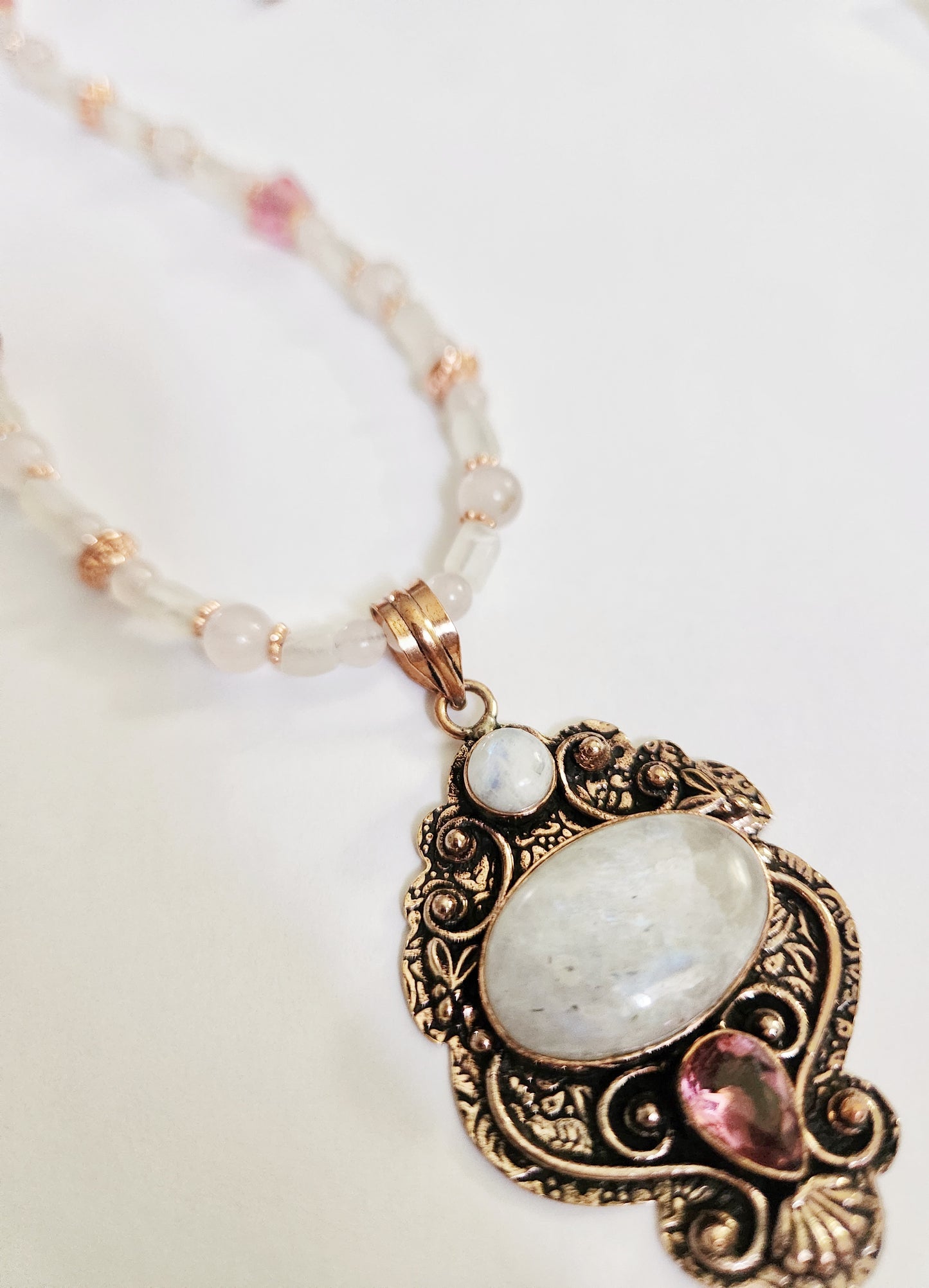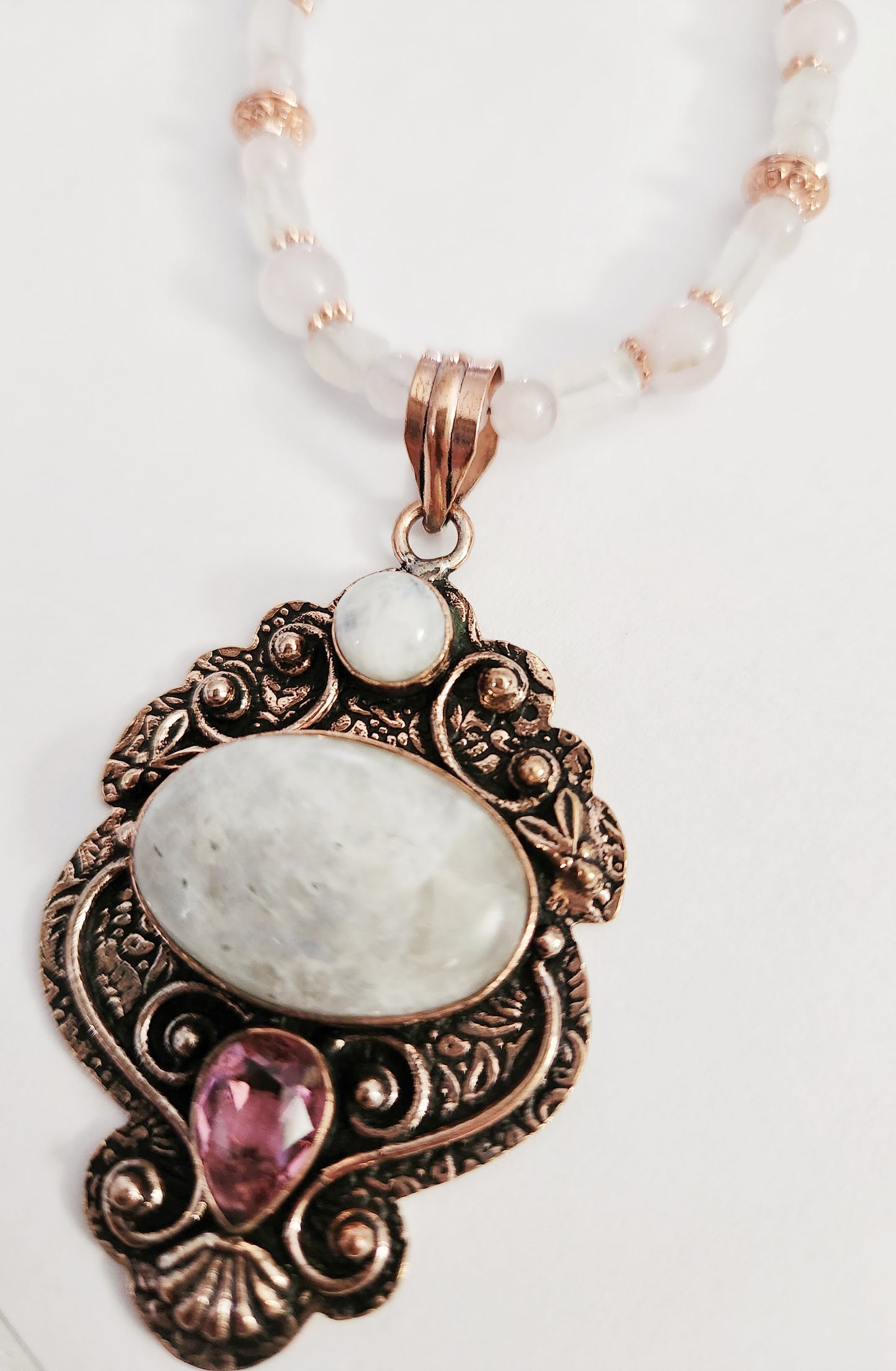 - Rainbow Moonstone and Pink Topaz bright copper pendant